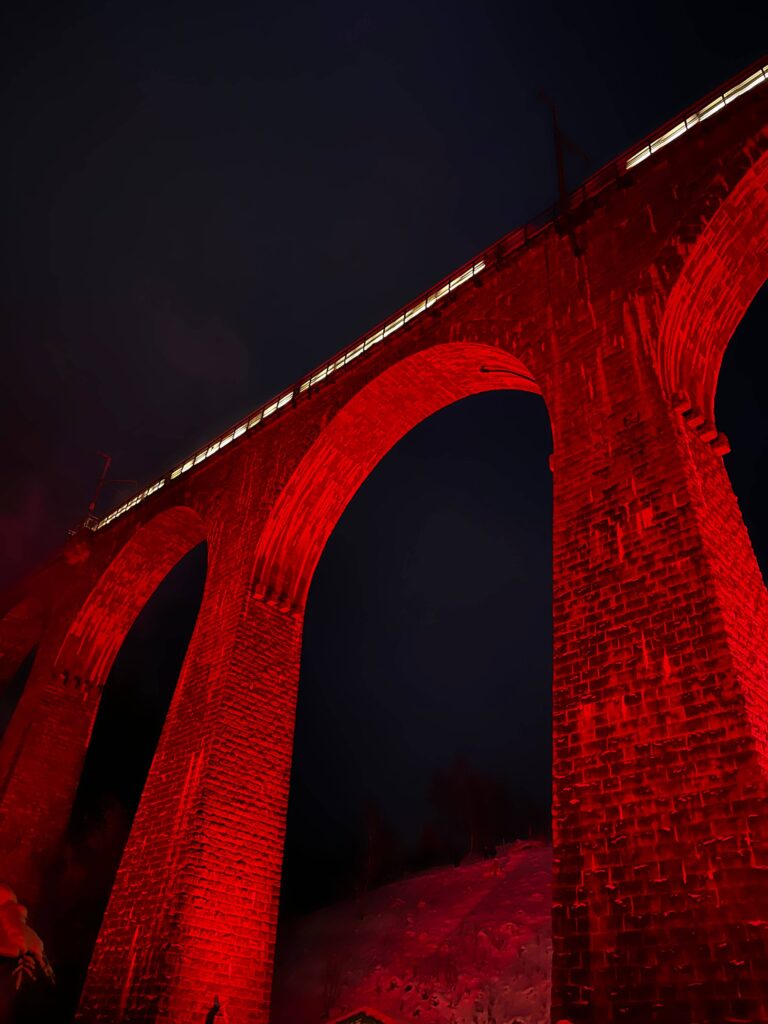 Once the sun goes down, they shine lights against the bridge that change colors throughout the night. It’s even more magical when the regional train drives over the bridge.