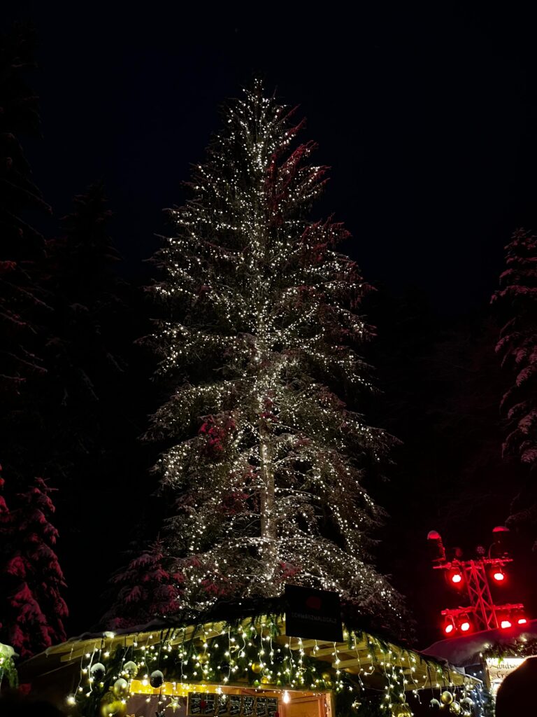 One cannot miss the giant Christmas tree adorned with thousands of twinkling lights, creating a mesmerizing centerpiece for the market square.