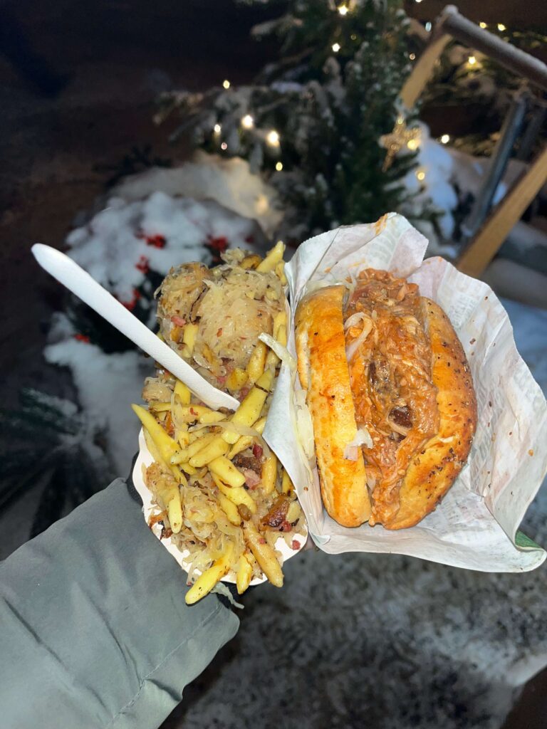 Food options at the market included fruits and chocolate, pulled beef and pork from the smoker, sausages, raclettes, flammkuchen, potato spirals, crepes and waffles, goulash soup, and more!