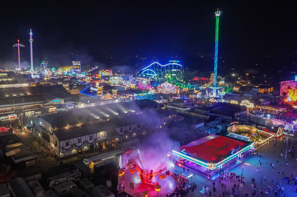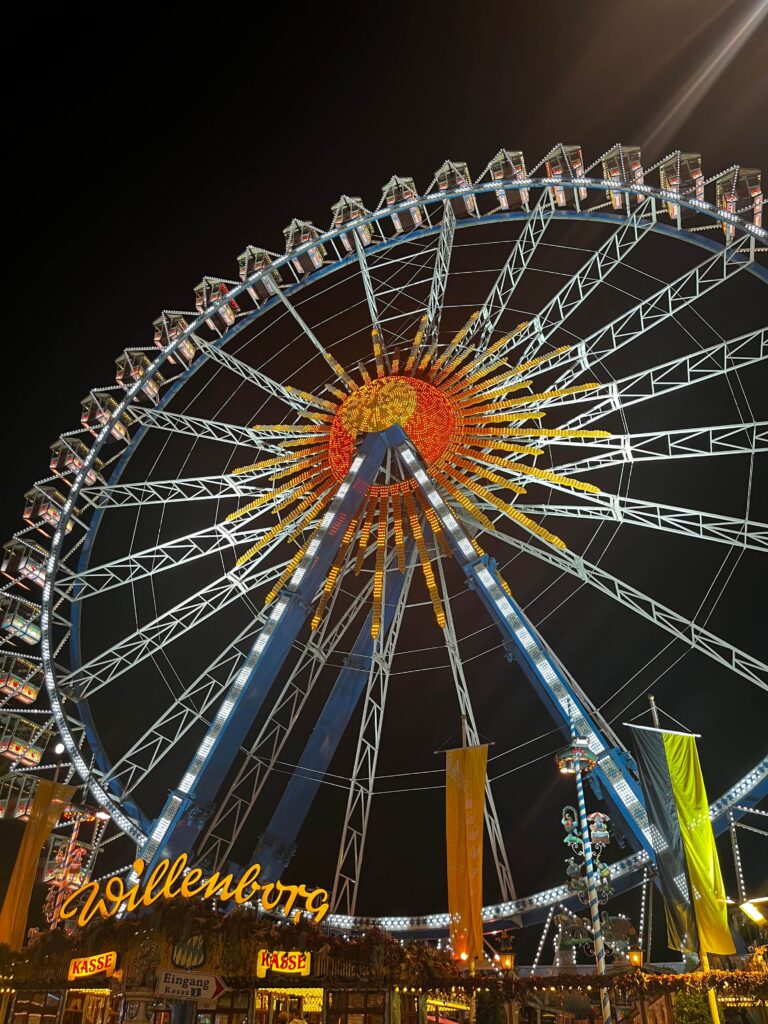 The Oktoberfest fairgrounds feature a variety of exhilarating rides, from the towering Ferris wheel to heart-pounding roller coasters.