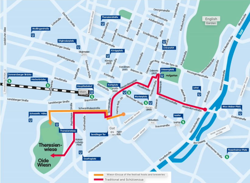 The parade of the Oktoberfest Landlords and Breweries parade route starts in Josephspitalstraße behind Sendlinger Tor, moves on to Sonnenstraße and turns left into Schwanthaler Straße. From there, the route goes straight onto the Bavariaring, then onto Wirtsbudenstraße and into the respective marquees.
